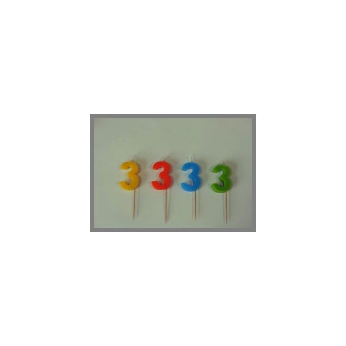 Bougie anniversaire sur pique en forme de chiffre 3. cette bougie mesure 9 cm. Plusieurs couleurs existantes : Modèle selon arrivage