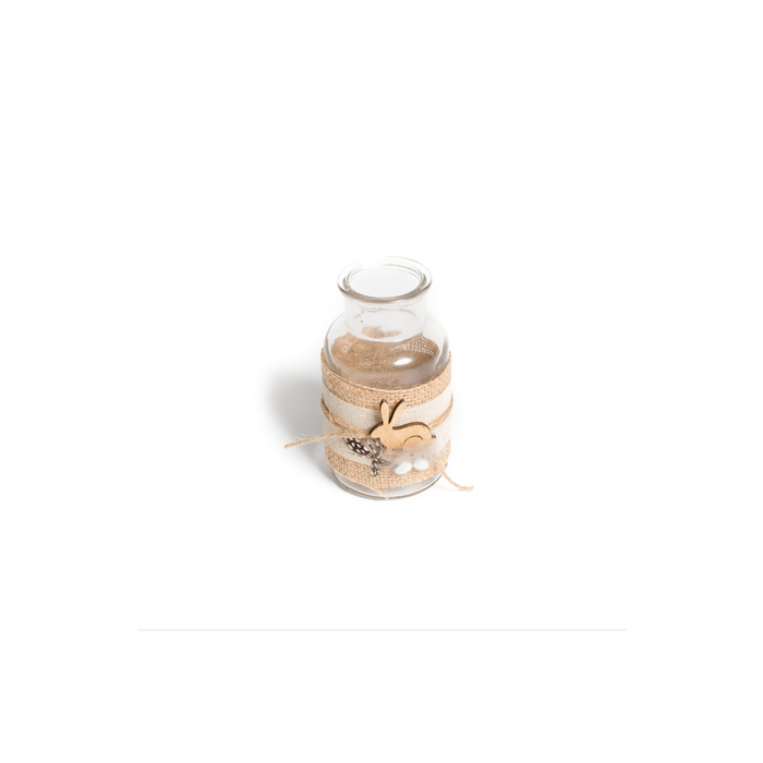 Votre décoration de table ne transmet pas assez cet esprit champêtre ? Pour parfaire votre décoration, nous vous proposons ce magnifique vase jute et lapin de dimension 6 cm x 12 cm. Ce vase en verre transparent est joliment décoré de toile de jute, de plumes et d'un petit lapin en bois. Idéal pour une superbe décoration de table pour Pâques, ce vase donnera beaucoup de charme à votre décoration, un détail qui ne laissera pas vos invités indifférents.